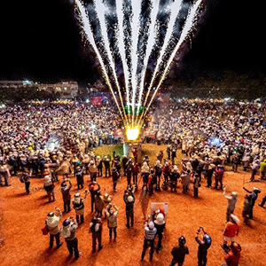 鹽水烽炮,位於台南市鹽水區,由鹽水武廟主辦,蜂炮的習俗源自清朝時期,相傳光緒11年(1885年)夏天,鹽水地區一帶引發瘟疫大流行,高達上千餘名人口死亡,地方民眾為祈求神蹟降臨,最後在武廟關聖帝君(關公)降旨遶境降魔、去除晦氣,信徒尾隨繞走疫區,沿途燃放炮竹直至天明。遶境結束後,鹽水疫情就此消退,而遶境當天正好是正月十五元宵節,民眾為感念神恩,每年元宵夜沿襲成例,演變為今日赫赫有名之蜂炮盛會。