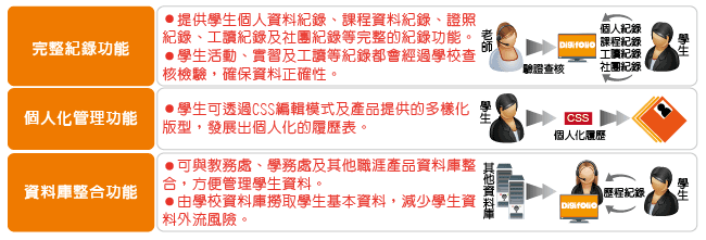 - 提供學生自我行銷平台,全程記錄個人學習經驗與成就。