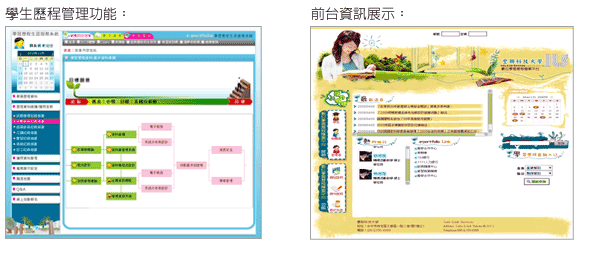 提供學生學習歷程製作、學習歷程製作精靈、基本資料維護、課程資料維護、活動資料維護、CSS樣式編輯、圖片檔案上傳、檔案管理、下載/上傳學習歷程、我的行事曆等管理